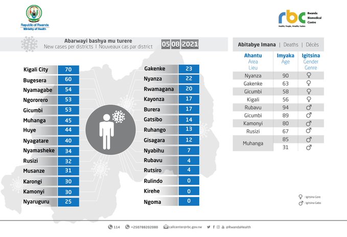 Minisante yatangaje ko abishwe na Coronavirus kuri uyu wa Kane, tariki ya 5 Kanama 2021, ari abagore bane n’abagabo batandatu.